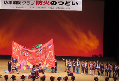 この防火のつどいは、湖南広域消防局が推進する幼少年期における防火防災プログラム「9 years plan」の一環として開催したもので、当消防局管内(草津市・守山市・栗東市・野洲市)に所属する幼年消防クラブのうち、5つの代表幼年消防クラブの園児たちによる防火演技等を通じて、幼年期における防火・防災への意識の高揚を目的とするものです。