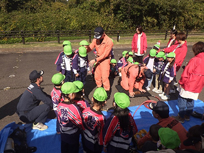 七ヶ浜町内の6施設が合同で令和7年10月27日(月)に「七ヶ浜サッカースタジアム」で開催し、「火の用心のうた」や「防火のちかい」を元気いっぱいに参加クラブ員全員で消防職員や保護者に披露した他、消防車との記念撮影や消防資器材の見学、はしご車への搭乗体験を通し防火・防災への興味を深めてもらいました。