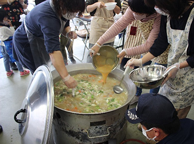 また、炊き出し訓練を行い、「一度に数十人規模の料理をする機会がないため、とても貴重な体験をすることができた。」との感想が聞かれ、有意義な研修会となりました。
