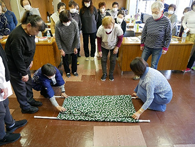 最後には、風呂敷をつなげて作る風呂敷ロープや風呂敷と長い棒を使用した簡易担架での救助活動を体験するなど、女性防火クラブ員相互が救助者と要救助者に分かれて実技を行うことで災害時の連携強化にもつながりました。
