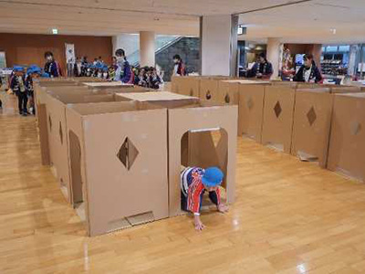 今回は体験型のイベントブースを7つ設けて、それぞれの幼年消防クラブごとにスタンプラリー方式で行いました。「火事が起こった際にはどうすればいいのか」を考えながら体験するブースや、「消防士はどんな仕事をしているのか」がわかるブースを設置。その他に、緊急消防援助隊が使用する資機材を展示して、実際の現場での活動を学ぶブースや、耐水ペーパーを使って防災紙コップを作るワークショップを実施しました。