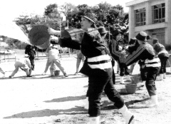 兵庫県の加東郡少年婦人防火委員会は、平成15年12月に「婦人防火の集い(消防競技大会)」を開きました。これまでは防災講演会を中心に開催してきましたが、同年度からは実践的な競技会方式に変更、管内の婦人防火クラブ員が講習会等で学んだ消火方法を実践披露しました。