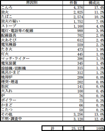 (2) 建物⽕災 建物⽕災25,127件を出⽕原因別にみますと、次表のとおりです。 ![]() |