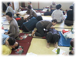 受講者は、班ごとに訓練用人形を使い「意識の確認」から