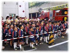 今回は、「学ぼう 未来の火消っ子」をテーマに各コーナーを設け、オープニングでは消防隊長からの「火の大切さと怖さ」のおはなしを聞き、全員で「防火のちかい」を元気良く大きな声で宣言、また、クラブ員参加による防火演劇「消太君のお誕生日は大騒ぎ」では「火遊び」の怖さを学び、「火遊びはしません」と約束、次に、消防資機材及び防火パネル展示コーナーによる消防の仕事の紹介、梯子車による訓練見学及び消防車両の見学など、どのコーナーにおいても職員の説明に興味深く聞き入り、クラブ員の真剣なようすが印象に残りました