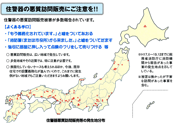 消防庁では、近年、増加傾向にある住宅火災の死者発生防止に有効な住宅用火災警報器(以下「住警器」という。)の普及を推進しており、一日も早い住警器設置を呼びかけるため、住警器の設置による奏功事例と悪質訪問販売事例を収集・紹介しています。