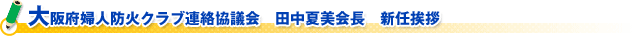 何卒、15年余の永きにわたり会長として大阪府婦人防火クラブ連絡協議会の発展に大きく寄与されました小林前会長同様、皆様方のご支援ご協力を賜りますよう心よりお願い申し上げ、簡単ではございますが会長就任のご挨拶といたします。