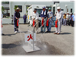 訓練は、消火・通報訓練指導車"けすゾウくん"の積載品を使用しての消火訓練や通報訓練の他、避難搬送訓練、救急講習会等を実施。この日は、一日一汗運動の奉仕作業をされた後ということで大勢の住民が参加、救急講習会ではAEDの取扱いについて多くの質問があるなど熱心に参加されていた。