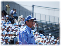 政府調査団として訓練を視察した麻生首相は、倒壊した建物から被災者を救助する訓練など視察した後、閉会式で訓練参加者及びスタンドで訓練を見守った地元の人たちを前に挨拶を述べ訓練を終了しました。