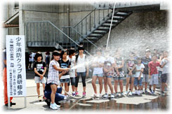 つどいでは、煙中体験、救急実技体験、放水体験や、地震体験車試乗、梯子車試乗など様々な体験・見学の時間を設けています。煙中体験では、「本当の火事では、有毒なガスで体が動けなくなったり、熱でのどが火傷したりします。」と聞いて、クラブ員たちは驚いていました。また、救急実技体験では、「いざという時、がんばるぞ」と、頼もしい声も聞かれました。実際にヘルメットをかぶり防火衣を着用しての放水体験は、ホースから出る水の勢いを手に感じ、的に描かれた炎を消そうと真剣な様子でした。うまく当てたときには「やったー・やったー」と声をあげ無邪気に笑う姿が見られました。