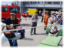 ロープ渡過では、地上約2メートルの高さに張られたロープを、ヘルメットを着けて、署員の補助を受けながら約10メートル先のゴールを目指しました。やっとのことで着いて一安心。