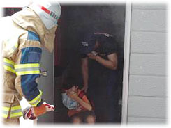 つどいでは、住宅用火災警報器の説明、煙中体験、救急実技体験、放水体験や、地震体験車試乗、梯子車試乗など様々な体験・見学の時間を設けています。住宅用火災警報器の説明では、設置場所や奏功例を一生懸命メモを取っているクラブ員、地震体験車では、最初は笑顔でイスに座っていた子供たちは、揺れが大きくなるにつれ座っているのがやっとの状態でした。「東日本大震災にあった人たちはこんな怖い思いをしたんだね。」と、貴重な体験をしていました。また、救急実技体験では、「いざという時は、まかせてね!」と、頼もしい声も聞かれました。実際にヘルメットをかぶり防火衣を着用しての放水体験は、ホースから出る水の勢いを手に感じ、的に描かれた炎を消そうと真剣な様子でした。うまく当てたときには「やったー・やったー」と声をあげ無邪気に笑う姿が見られ、ロープ結索では、いろいろな結び方を習いました。それぞれの体験が終わり、全員で救助隊による救助演技を見学しました。