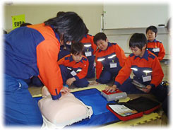 参加した20名のクラブ員は2日間様々な訓練に取り組み、中でも、応急手当訓練では、消防職員が説明するAEDを使用した心肺蘇生法の説明に熱心に耳を傾け、心臓マッサージを実施する際には、人形を相手に自分の押した力で振り回されながらも、全体重を使って一生懸命取り組んでいました。訓練の後は「困っている人がいたら勇気を出して助けたい。」、「家族にも教えてあげたい。」等の声が聞かれました。