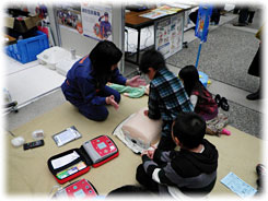 体育館内では、身の周りの物で作る体験コーナーとして、紙パックでお皿、ポリ袋でレインコート、段ボールで簡易トイレやパーティションなど色々な防災アイテムを実際に作ってもらいました。
