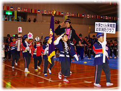 まず、第1部の「式典」では12クラブの園児達がそれぞれ消防ハッピ姿に身を包み、プラカードを先頭に指揮者以下元気に入場行進し開会しました。