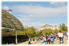 第2部では、埼玉県防災航空隊のヘリコプターによる林野火災を想定した散水消火訓練や建物屋上に避難した人を助ける救出救助訓練を見学しました。大会の参加者たちは、見学席の近くで繰り広げられるヘリコプターの訓練に大変感激していました。