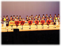 活動発表は幼年期らしい身体を使った元気なものばかりでしたが、火災の恐ろしさや火気の取扱についてのメッセージが随所に見られ、父母には「火を使うときはその場を離れないで。」と呼びかけ、代表園児2名による防火のちかいでは「火遊びは絶対にしません。」と宣言しました。