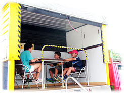 つどいでは、住宅用火災警報器の説明、煙中体験、救急実技体験、放水体験や、地震体験車試乗、梯子車試乗など様々な体験・見学の時間を設けています。住宅用火災警報器の説明では、「僕の部屋には、ずっと前から設置してあるよ」とか「私の家にも設置してあるよ」と、声が聞こえてきました。今年は、輪投げコーナーの上位者には、賞品が出ることから、みんな真剣に、119の数字に入れていました。