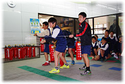 少年消防クラブ大会の内容は、クラブ役員(児童会代表)が司会をし、全校児童による防火の誓いに始まり、消防音楽隊の演奏をはじめ消防車両(ポンプ車・救急車)の見学、天ぷら油火災実験の見学、4・5・6年生が参加した各種火災を想定した初期消火訓練(消火器・三角バケツ・バケツリレーによる消火訓練)並びに、全校生徒が参加した煙体験など火災体験学習を目的とした大会が実施されました。