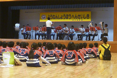 クラブ員は、クラブ員章を受け取った後、消防署員が演じる防火寸劇や消防音楽隊の演奏を鑑賞し、最後に「火あそびは絶対にしません」と力強く誓いました。