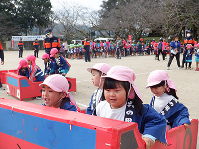 運動会は幼年消防クラブ員代表による、元気のよい「防火の誓い」で始まり、消火器を載せた「みこし」や「おもちゃ消防車」を使用するゲームや、組別対抗リレー、玉入れのほか、煙体験ハウス、放水体験、地震体験車での地震体験、救助工作車との綱引きなどを行いました。こども達には好評で「楽しかった」「煙の中は真っ白で何も見えなかった」「水をもう一回出してみたい」「地震の揺れが怖かった」といった感想がありました。保護者の方からは「体験コーナーが保護者も体験出来、防火防災の事を意識する良い機会になりました」と感想を頂きました。