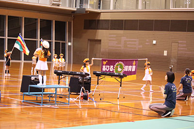 各クラブ代表の園児8名が八尾市長に対して「火遊びはしません」と防火の誓いを宣言した後、順次各園の演技が始まり、かわいいコスチュームに身を包んだ園児たちは、日頃からの練習成果を充分に発揮し、小太鼓・大太鼓などを操りながら見事なドリル演奏を披露しました。