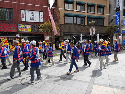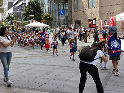パレードでは、消防音楽隊の演奏を先頭に、幼年消防クラブ員は鼓笛演奏や踊りを行いながら、また、女性防火クラブ、スーパーエイジ防火クラブ員は火の用心の小旗を持ち、総勢508名により市内中心部を行進し、多くの市民に向けて火災予防を呼びかけました。