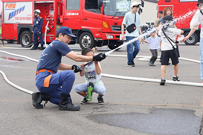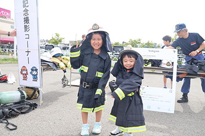子どもたちは、初期消火体験、煙体験ハウス、応急手当、放水体験などの各種コーナーを体験したほか、消防車両の見学や、子ども用防火衣を着て消防車をバックに写真撮影をするなど楽しみました。どのコーナーも参加者が長い列を作り、閉会まで途切れることがないほどの盛況ぶりでした。