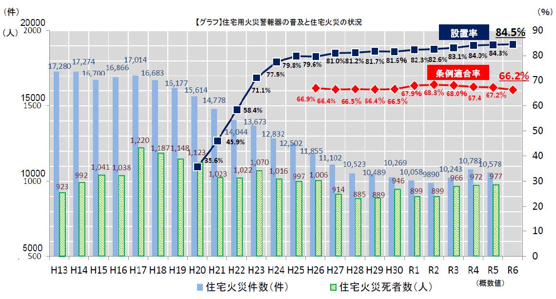 我が国における住宅火災件数及び住宅火災による死者数は、新築住宅に対する住警器の設置義務化がスタートした平成18年以降、おおむね減少傾向にあり、住警器の普及促進を始めとした住宅防火対策に一定の効果が現れていると考えられます(グラフ参照)。