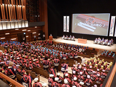 市内の幼年消防クラブ21クラブ、来賓その他関係者を含む600名が参加し、消防職員による仕事紹介、火災映像の上映や〇×クイズによる防火啓発が実施されました。大会の終盤では、園児たちによる「防火の誓い」が元気いっぱい唱えられ、火遊びをしないことを約束してくれました。