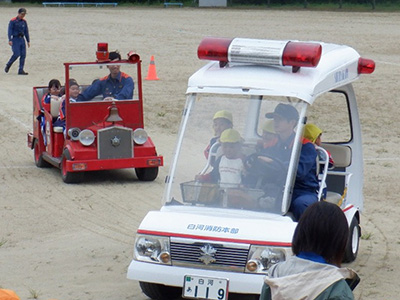 運動会は幼年消防クラブ員代表による、元気のよい「防火の誓い」で始まり、「おもちゃ消防車」及び消火器を載せた「みこし」を使用するゲーム並びに、防火衣リレーのほか、玉入れ、消防車と力くらべ、煙体験ハウス、放水体験、水消火器の体験などを行いました。